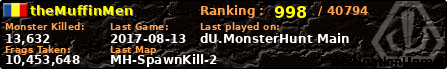 theMuffinMen | | PlayerID: | 30189 | | Overall MHT: | 10,453,648 | | Overall Deaths: | 186 | | Overall Suicides: | 4 | | Overall TeamKills: | 1 | | Overall Distance traveled: | 511km | | Overall Time Spend on Server: | 01days 19h 41m 48s | | Maps Played: | 155 | | Firstgame: | 2017-07-10 07:31:45 | | LastGame: | 2017-08-13 12:33:48 | | Player Ranking Place: | 998 | | Used Playernames: | theMuffinMen