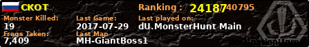 ![]() | MH-GiantBoss1 | 2017-07-29 17:36:26 | 1,894 | 99237 | 4 | 1 | 0 | 0 | 0,58km | 00:17:21 |