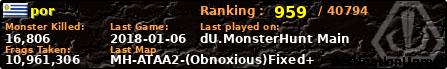 por | | PlayerID: | 30876 | | Overall MHT: | 10,961,306 | | Overall Deaths: | 737 | | Overall Suicides: | 0 | | Overall TeamKills: | 10 | | Overall Distance traveled: | 1,131km | | Overall Time Spend on Server: | 04days 03h 51m 41s | | Maps Played: | 316 | | Firstgame: | 2017-09-22 22:58:56 | | LastGame: | 2018-01-06 02:40:19 | | Player Ranking Place: | 959 | | Used Playernames: | por FRANCO