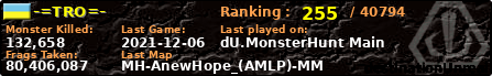 -=TRO=- | | PlayerID: | 32051 | | Overall MHT: | 80,406,087 | | Overall Deaths: | 3703 | | Overall Suicides: | 60 | | Overall TeamKills: | 1 | | Overall Distance traveled: | 4,462km | | Overall Time Spend on Server: | 13days 04h 44m 46s | | Maps Played: | 1210 | | Firstgame: | 2018-01-07 13:17:16 | | LastGame: | 2021-12-06 17:38:06 | | Player Ranking Place: | 255 | | Used Playernames: | -=TRO=-