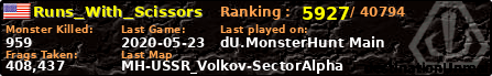 Runs_With_Scissors | | PlayerID: | 32187 | | Overall MHT: | 408,437 | | Overall Deaths: | 206 | | Overall Suicides: | 0 | | Overall TeamKills: | 2 | | Overall Distance traveled: | 163km | | Overall Time Spend on Server: | 00days 13h 40m 31s | | Maps Played: | 47 | | Firstgame: | 2018-01-19 22:50:25 | | LastGame: | 2020-05-23 22:51:40 | | Player Ranking Place: | 5927 | | Used Playernames: | Runs_With_Scissors