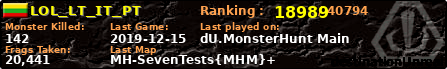 LOL_LT_IT_PT | | PlayerID: | 32616 | | Overall MHT: | 20,441 | | Overall Deaths: | 107 | | Overall Suicides: | 3 | | Overall TeamKills: | 0 | | Overall Distance traveled: | 43km | | Overall Time Spend on Server: | 00days 04h 38m 53s | | Maps Played: | 27 | | Firstgame: | 2018-02-24 08:39:11 | | LastGame: | 2019-12-15 09:48:07 | | Player Ranking Place: | 18989 | | Used Playernames: | LOL_LT_IT_PT Deivas Justinas LOL_JOK_GGGG_PL_NNNN