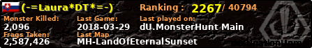 (-=Laura*DT*=-) | | PlayerID: | 32856 | | Overall MHT: | 2,587,426 | | Overall Deaths: | 138 | | Overall Suicides: | 4 | | Overall TeamKills: | 2 | | Overall Distance traveled: | 116km | | Overall Time Spend on Server: | 00days 12h 22m 49s | | Maps Played: | 79 | | Firstgame: | 2018-03-17 14:42:37 | | LastGame: | 2018-03-29 13:06:05 | | Player Ranking Place: | 2267 | | Used Playernames: | (-=Laura*DT*=-)