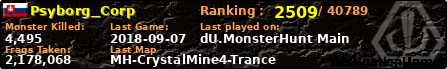 Psyborg_Corp | | PlayerID: | 33620 | | Overall MHT: | 2,178,068 | | Overall Deaths: | 286 | | Overall Suicides: | 28 | | Overall TeamKills: | 0 | | Overall Distance traveled: | 352km | | Overall Time Spend on Server: | 01days 07h 44m 19s | | Maps Played: | 114 | | Firstgame: | 2018-06-22 00:14:58 | | LastGame: | 2018-09-07 22:31:31 | | Player Ranking Place: | 2509 | | Used Playernames: | Psyborg_Corp YelworC Forever_not_Yours Psyborg_Corp__cursed Psyborg_Corp_R.I.P.