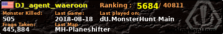 DJ_agent_waeroon | | PlayerID: | 33817 | | Overall MHT: | 445,884 | | Overall Deaths: | 135 | | Overall Suicides: | 6 | | Overall TeamKills: | 0 | | Overall Distance traveled: | 116km | | Overall Time Spend on Server: | 00days 08h 05m 40s | | Maps Played: | 29 | | Firstgame: | 2018-07-28 03:56:18 | | LastGame: | 2018-08-18 01:52:14 | | Player Ranking Place: | 5684 | | Used Playernames: | DJ_agent_waeroon