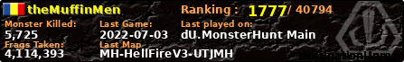 theMuffinMen | | PlayerID: | 34128 | | Overall MHT: | 4,114,393 | | Overall Deaths: | 39 | | Overall Suicides: | 0 | | Overall TeamKills: | 0 | | Overall Distance traveled: | 169km | | Overall Time Spend on Server: | 00days 14h 19m 11s | | Maps Played: | 45 | | Firstgame: | 2018-09-08 20:37:02 | | LastGame: | 2022-07-03 17:55:13 | | Player Ranking Place: | 1777 | | Used Playernames: | theMuffinMen