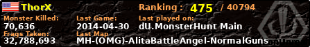 ThorX | | PlayerID: | 344 | | Overall MHT: | 32,788,693 | | Overall Deaths: | 10153 | | Overall Suicides: | 43 | | Overall TeamKills: | 65 | | Overall Distance traveled: | 6,930km | | Overall Time Spend on Server: | 25days 03h 27m 06s | | Maps Played: | 2637 | | Firstgame: | 2010-08-06 21:37:10 | | LastGame: | 2014-04-30 22:00:36 | | Player Ranking Place: | 475 | | Used Playernames: | ThorX