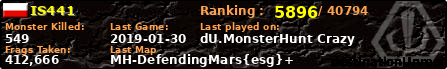 | Server | Map | LastGame | Score | Teamscore | Monsterleft | Deaths | Suicides | TKs | Distance | Playtime | |