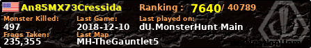 An85MX73Cressida | | PlayerID: | 34567 | | Overall MHT: | 235,355 | | Overall Deaths: | 65 | | Overall Suicides: | 0 | | Overall TeamKills: | 0 | | Overall Distance traveled: | 51km | | Overall Time Spend on Server: | 00days 03h 44m 25s | | Maps Played: | 15 | | Firstgame: | 2018-11-27 19:42:08 | | LastGame: | 2018-12-10 22:20:46 | | Player Ranking Place: | 7640 | | Used Playernames: | An85MX73Cressida OneMX73Cressida