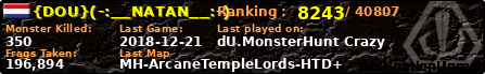 | Server | Map | LastGame | Score | Teamscore | Monsterleft | Deaths | Suicides | TKs | Distance | Playtime | |