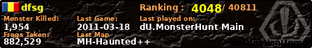 dfsg | | PlayerID: | 3537 | | Overall MHT: | 882,529 | | Overall Deaths: | 48 | | Overall Suicides: | 0 | | Overall TeamKills: | 1 | | Overall Distance traveled: | 58km | | Overall Time Spend on Server: | 00days 04h 50m 57s | | Maps Played: | 21 | | Firstgame: | 2011-03-09 10:10:14 | | LastGame: | 2011-03-18 16:54:05 | | Player Ranking Place: | 4048 | | Used Playernames: | dfsg ina