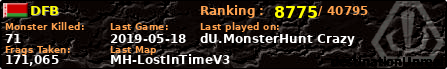 | Server | Map | LastGame | Score | Teamscore | Monsterleft | Deaths | Suicides | TKs | Distance | Playtime | |
