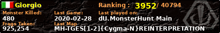 Giorgio | | PlayerID: | 35486 | | Overall MHT: | 925,254 | | Overall Deaths: | 108 | | Overall Suicides: | 6 | | Overall TeamKills: | 0 | | Overall Distance traveled: | 78km | | Overall Time Spend on Server: | 00days 07h 12m 01s | | Maps Played: | 25 | | Firstgame: | 2019-05-19 23:06:21 | | LastGame: | 2020-02-28 19:59:54 | | Player Ranking Place: | 3952 | | Used Playernames: | Giorgio