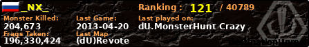 _NX_ | | PlayerID: | 3555 | | Overall MHT: | 196,330,424 | | Overall Deaths: | 3949 | | Overall Suicides: | 23 | | Overall TeamKills: | 62 | | Overall Distance traveled: | 5,924km | | Overall Time Spend on Server: | 22days 02h 02m 31s | | Maps Played: | 1849 | | Firstgame: | 2011-03-10 20:09:41 | | LastGame: | 2013-04-20 14:29:28 | | Player Ranking Place: | 121 | | Used Playernames: | _NX_