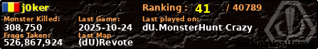 j0ker | | PlayerID: | 36550 | | Overall MHT: | 526,867,924 | | Overall Deaths: | 544 | | Overall Suicides: | 53 | | Overall TeamKills: | 0 | | Overall Distance traveled: | 3,782km | | Overall Time Spend on Server: | 13days 12h 05m 59s | | Maps Played: | 948 | | Firstgame: | 2020-02-02 16:30:51 | | LastGame: | 2025-10-24 12:37:11 | | Player Ranking Place: | 41 | | Used Playernames: | j0ker