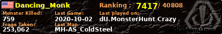 Dancing_Monk | | PlayerID: | 36969 | | Overall MHT: | 253,062 | | Overall Deaths: | 135 | | Overall Suicides: | 0 | | Overall TeamKills: | 0 | | Overall Distance traveled: | 101km | | Overall Time Spend on Server: | 00days 05h 56m 57s | | Maps Played: | 20 | | Firstgame: | 2020-03-31 03:51:36 | | LastGame: | 2020-10-02 09:43:07 | | Player Ranking Place: | 7417 | | Used Playernames: | Dancing_Monk
