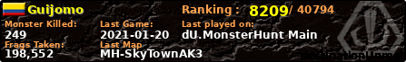 Guijomo | | PlayerID: | 37306 | | Overall MHT: | 198,552 | | Overall Deaths: | 21 | | Overall Suicides: | 0 | | Overall TeamKills: | 0 | | Overall Distance traveled: | 39km | | Overall Time Spend on Server: | 00days 03h 02m 28s | | Maps Played: | 17 | | Firstgame: | 2020-04-28 17:54:33 | | LastGame: | 2021-01-20 21:47:41 | | Player Ranking Place: | 8209 | | Used Playernames: | Guijomo