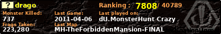 drago | | PlayerID: | 3794 | | Overall MHT: | 223,280 | | Overall Deaths: | 140 | | Overall Suicides: | 0 | | Overall TeamKills: | 1 | | Overall Distance traveled: | 78km | | Overall Time Spend on Server: | 00days 05h 47m 26s | | Maps Played: | 15 | | Firstgame: | 2011-03-23 21:34:46 | | LastGame: | 2011-04-06 22:45:14 | | Player Ranking Place: | 7808 | | Used Playernames: | drago