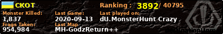 | MH-GodzReturn++ | 2020-09-13 13:26:08 | 266,301 | 126042 | 87 | 3 | 0 | 0 | 11,07km | 01:13:00 | |