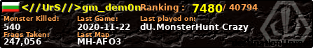 | Server | Map | LastGame | Score | Teamscore | Monsterleft | Deaths | Suicides | TKs | Distance | Playtime | |
