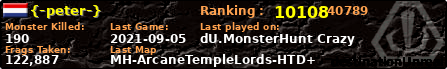 {-peter-} | | PlayerID: | 38450 | | Overall MHT: | 122,887 | | Overall Deaths: | 69 | | Overall Suicides: | 1 | | Overall TeamKills: | 1 | | Overall Distance traveled: | 52km | | Overall Time Spend on Server: | 00days 06h 08m 55s | | Maps Played: | 60 | | Firstgame: | 2020-11-22 18:57:46 | | LastGame: | 2021-09-05 14:38:33 | | Player Ranking Place: | 10108 | | Used Playernames: | {-peter-} -}ch@ser-{ P-er@SER [MHA]Er@ser [FoG]Er@ser <[MHA]>er@ser -{eR@SER}-