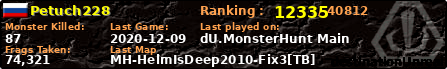![]() | MH-TheGauntlet | 2020-12-09 20:46:26 | 0 | 49911 | 6 | 0 | 0 | 0 | 0,07km | 00:08:38 |