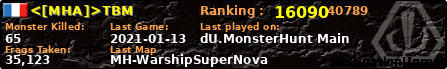 ![]() | MH-MonsterTownDepotX | 2021-01-10 20:17:23 | 0 | 114776 | ![]() | 0 | 0 | 0 | 0,03km | 00:20:52 |