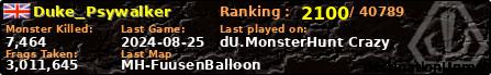 Duke_Psywalker | | PlayerID: | 39158 | | Overall MHT: | 3,011,645 | | Overall Deaths: | 399 | | Overall Suicides: | 1 | | Overall TeamKills: | 0 | | Overall Distance traveled: | 532km | | Overall Time Spend on Server: | 01days 15h 05m 03s | | Maps Played: | 93 | | Firstgame: | 2021-04-13 22:06:39 | | LastGame: | 2024-08-25 10:50:02 | | Player Ranking Place: | 2100 | | Used Playernames: | Duke_Psywalker