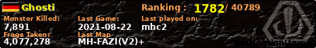 Ghosti | | PlayerID: | 39297 | | Overall MHT: | 4,077,278 | | Overall Deaths: | 148 | | Overall Suicides: | 0 | | Overall TeamKills: | 0 | | Overall Distance traveled: | 167km | | Overall Time Spend on Server: | 00days 16h 48m 46s | | Maps Played: | 42 | | Firstgame: | 2021-06-03 14:14:51 | | LastGame: | 2021-08-22 00:52:18 | | Player Ranking Place: | 1782 | | Used Playernames: | Ghosti