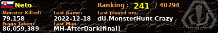 Neto | | PlayerID: | 39385 | | Overall MHT: | 86,059,389 | | Overall Deaths: | 532 | | Overall Suicides: | 21 | | Overall TeamKills: | 1 | | Overall Distance traveled: | 1,531km | | Overall Time Spend on Server: | 05days 22h 10m 01s | | Maps Played: | 472 | | Firstgame: | 2021-07-11 10:04:00 | | LastGame: | 2022-12-18 11:50:43 | | Player Ranking Place: | 241 | | Used Playernames: | Neto