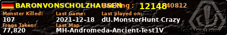 BARONVONSCHOLZHAUSEN | | PlayerID: | 39393 | | Overall MHT: | 77,820 | | Overall Deaths: | 13 | | Overall Suicides: | 0 | | Overall TeamKills: | 0 | | Overall Distance traveled: | 19km | | Overall Time Spend on Server: | 00days 01h 21m 12s | | Maps Played: | 6 | | Firstgame: | 2021-07-13 20:14:08 | | LastGame: | 2021-12-18 16:49:03 | | Player Ranking Place: | 12148 | | Used Playernames: | BARONVONSCHOLZHAUSEN THE_INJECTION GEORGIA_GUIDESTONES