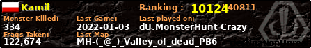 | Server | Map | LastGame | Score | Teamscore | Monsterleft | Deaths | Suicides | TKs | Distance | Playtime | |