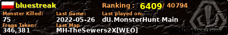 | Server | Map | LastGame | Score | Teamscore | Monsterleft | Deaths | Suicides | TKs | Distance | Playtime | |
