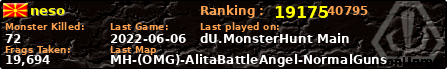 | Server | Map | LastGame | Score | Teamscore | Monsterleft | Deaths | Suicides | TKs | Distance | Playtime | |