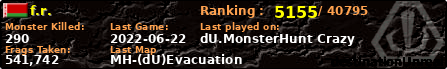| Server | Map | LastGame | Score | Teamscore | Monsterleft | Deaths | Suicides | TKs | Distance | Playtime | |