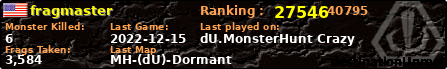 | Server | Map | LastGame | Score | Teamscore | Monsterleft | Deaths | Suicides | TKs | Distance | Playtime | |