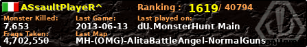 ASsaultPlayeR^ | | PlayerID: | 4229 | | Overall MHT: | 4,702,550 | | Overall Deaths: | 706 | | Overall Suicides: | 36 | | Overall TeamKills: | 4 | | Overall Distance traveled: | 611km | | Overall Time Spend on Server: | 01days 16h 55m 03s | | Maps Played: | 201 | | Firstgame: | 2011-04-20 19:06:05 | | LastGame: | 2013-06-13 17:23:53 | | Player Ranking Place: | 1619 | | Used Playernames: | ASsaultPlayeR^ G!nak^ -Chianti.ita!- -.ita!- `SideburnsAndGuinnes -Chianti.ita- pnus Er.Freddo ]3`F[~Chianti! +_*