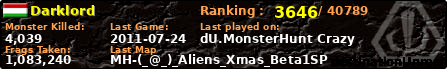 Darklord | | PlayerID: | 4820 | | Overall MHT: | 1,083,240 | | Overall Deaths: | 504 | | Overall Suicides: | 8 | | Overall TeamKills: | 0 | | Overall Distance traveled: | 112km | | Overall Time Spend on Server: | 00days 08h 41m 07s | | Maps Played: | 17 | | Firstgame: | 2011-05-30 23:55:27 | | LastGame: | 2011-07-24 03:08:56 | | Player Ranking Place: | 3646 | | Used Playernames: | Darklord