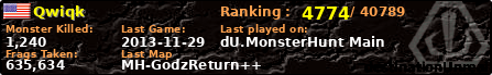 Qwiqk | | PlayerID: | 5084 | | Overall MHT: | 635,634 | | Overall Deaths: | 88 | | Overall Suicides: | 1 | | Overall TeamKills: | 1 | | Overall Distance traveled: | 71km | | Overall Time Spend on Server: | 00days 04h 56m 42s | | Maps Played: | 22 | | Firstgame: | 2011-06-21 00:19:28 | | LastGame: | 2013-11-29 23:08:11 | | Player Ranking Place: | 4774 | | Used Playernames: | Qwiqk ImLazy
