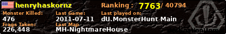henryhaskornz | | PlayerID: | 5294 | | Overall MHT: | 226,448 | | Overall Deaths: | 82 | | Overall Suicides: | 0 | | Overall TeamKills: | 3 | | Overall Distance traveled: | 64km | | Overall Time Spend on Server: | 00days 04h 59m 20s | | Maps Played: | 23 | | Firstgame: | 2011-07-09 14:41:24 | | LastGame: | 2011-07-11 16:01:42 | | Player Ranking Place: | 7763 | | Used Playernames: | henryhaskornz