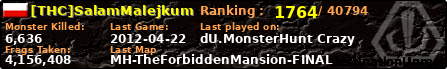 [THC]SalamMalejkum | | PlayerID: | 5854 | | Overall MHT: | 4,156,408 | | Overall Deaths: | 130 | | Overall Suicides: | 3 | | Overall TeamKills: | 3 | | Overall Distance traveled: | 226km | | Overall Time Spend on Server: | 00days 19h 56m 30s | | Maps Played: | 48 | | Firstgame: | 2011-08-23 17:36:36 | | LastGame: | 2012-04-22 01:36:14 | | Player Ranking Place: | 1764 | | Used Playernames: | [THC]SalamMalejkum Salam/MarekN/Lintehi Natanek_Szatanek