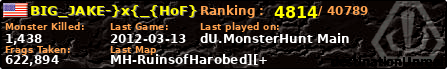 BIG_JAKE-}x{_{HoF} | | PlayerID: | 6288 | | Overall MHT: | 622,894 | | Overall Deaths: | 86 | | Overall Suicides: | 1 | | Overall TeamKills: | 0 | | Overall Distance traveled: | 81km | | Overall Time Spend on Server: | 00days 06h 40m 16s | | Maps Played: | 26 | | Firstgame: | 2011-09-29 08:25:58 | | LastGame: | 2012-03-13 07:54:43 | | Player Ranking Place: | 4814 | | Used Playernames: | BIG_JAKE-}x{_{HoF} ION-STORM