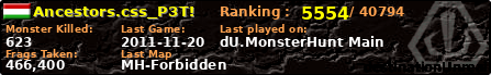 Ancestors.css_P3T! | | PlayerID: | 6328 | | Overall MHT: | 466,400 | | Overall Deaths: | 154 | | Overall Suicides: | 5 | | Overall TeamKills: | 4 | | Overall Distance traveled: | 101km | | Overall Time Spend on Server: | 00days 09h 20m 19s | | Maps Played: | 47 | | Firstgame: | 2011-10-01 14:11:57 | | LastGame: | 2011-11-20 21:45:23 | | Player Ranking Place: | 5554 | | Used Playernames: | Ancestors.css_P3T!