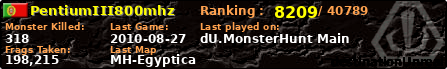 | Server | Map | LastGame | Score | Teamscore | Monsterleft | Deaths | Suicides | TKs | Distance | Playtime | |