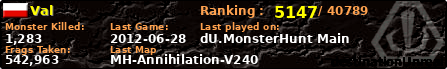Val | | PlayerID: | 6694 | | Overall MHT: | 542,963 | | Overall Deaths: | 279 | | Overall Suicides: | 0 | | Overall TeamKills: | 2 | | Overall Distance traveled: | 167km | | Overall Time Spend on Server: | 00days 12h 23m 47s | | Maps Played: | 46 | | Firstgame: | 2011-10-23 23:30:57 | | LastGame: | 2012-06-28 23:16:10 | | Player Ranking Place: | 5147 | | Used Playernames: | Val