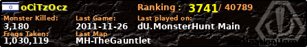 oCiTzOcz | | PlayerID: | 6715 | | Overall MHT: | 1,030,119 | | Overall Deaths: | 134 | | Overall Suicides: | 0 | | Overall TeamKills: | 1 | | Overall Distance traveled: | 123km | | Overall Time Spend on Server: | 00days 10h 11m 02s | | Maps Played: | 44 | | Firstgame: | 2011-10-24 22:01:31 | | LastGame: | 2011-11-26 05:19:15 | | Player Ranking Place: | 3741 | | Used Playernames: | oCiTzOcz osher kelv_ata reefer_lee