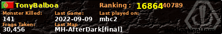 | Server | Map | LastGame | Score | Teamscore | Monsterleft | Deaths | Suicides | TKs | Distance | Playtime | |