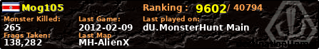 Mog105 | | PlayerID: | 8271 | | Overall MHT: | 138,282 | | Overall Deaths: | 66 | | Overall Suicides: | 0 | | Overall TeamKills: | 0 | | Overall Distance traveled: | 48km | | Overall Time Spend on Server: | 00days 02h 43m 32s | | Maps Played: | 17 | | Firstgame: | 2012-01-31 20:48:06 | | LastGame: | 2012-02-09 22:59:48 | | Player Ranking Place: | 9602 | | Used Playernames: | Mog105