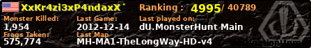 XxKr4zi3xP4ndaxX´ | | PlayerID: | 8610 | | Overall MHT: | 575,774 | | Overall Deaths: | 273 | | Overall Suicides: | 5 | | Overall TeamKills: | 1 | | Overall Distance traveled: | 151km | | Overall Time Spend on Server: | 00days 11h 18m 17s | | Maps Played: | 55 | | Firstgame: | 2012-02-26 23:04:41 | | LastGame: | 2012-12-14 02:21:30 | | Player Ranking Place: | 4995 | | Used Playernames: | XxKr4zi3xP4ndaxX´ [-BT-]XKraziexPanda -=]UM[=-Br0k3n [T]3rMinAto[R] ||~TsK~||*Sm0ker* Fr0sty [xDx]Fr0sty XxK1NGxTradgeyX