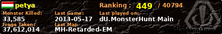 petya | | PlayerID: | 910 | | Overall MHT: | 37,612,014 | | Overall Deaths: | 3468 | | Overall Suicides: | 15 | | Overall TeamKills: | 44 | | Overall Distance traveled: | 2,299km | | Overall Time Spend on Server: | 08days 00h 21m 41s | | Maps Played: | 783 | | Firstgame: | 2010-08-27 17:42:52 | | LastGame: | 2013-05-17 13:38:53 | | Player Ranking Place: | 449 | | Used Playernames: | petya gyilkos BRUTLIS_LLAT